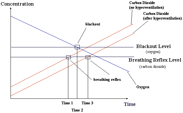 Hyperventilation erhöht den Sauerstoffgehalt im Blut nur unwesentlich. Gravierender ist allerdings die Abnahme der Kohlendioxid-Konzentration die auch hauptsächliche Ursache für das Auftreten eines Schwimmbad-Blackouts ist. Das Atemzentrum wird nicht durch geringe Sauerstoff-Level stimuliert, sondern durch hohe Kohlendioxid-Konzentrationen (über den pH-Wert des Blutes). Wird der Atem angehalten sinkt der Sauerstoffgehalt im Blut, die Kohlendioxidkonzentration steigt stetig an. Ab einer gewissen Kohlendioxidkonzentration wird das Atemzentrum stimuliert, der Taucher verspürt den Drang zu atmen. Das Absenken des Kohlendioxid-Levels durch Hyperventilation kann dazu führen, daß der Atemreflex selbst dann noch nicht einsetzt, wenn der Sauerstoffgehalt im Blut unter die Blackoutschwelle gesunken ist. Die Folge ist eine plötzlich eintretende Bewußtlosigkeit.